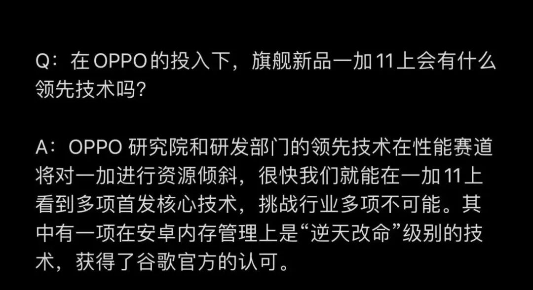 在采访环节官方预热一加11将会有多项首发核心技术,其中一项在安卓内存管理上是“逆天改命”级别的技术,获得了谷歌官方的认可。