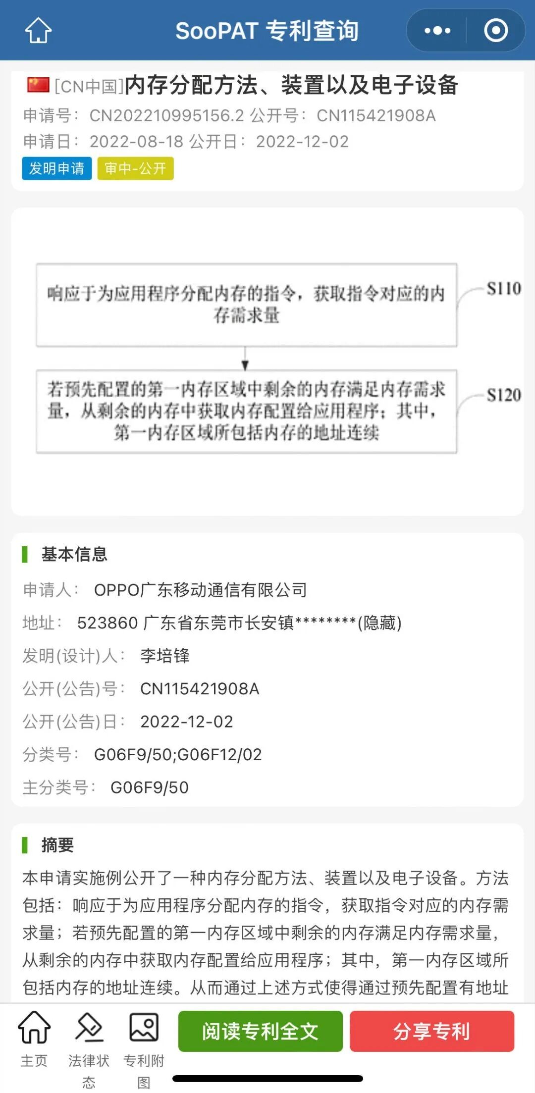 另外,OPPO申请的《内存分配方法、装置以及电子设备》专利也能查到了, 应该指的是同一个技术,现在就等后续一加11发布实测看看体验如何了。