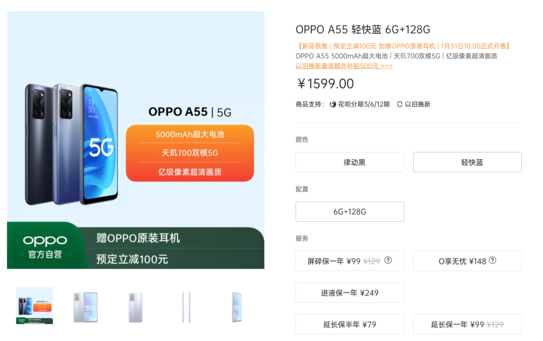 OPPO A55 6+128GB售价1599元,首发到手价1499元。
