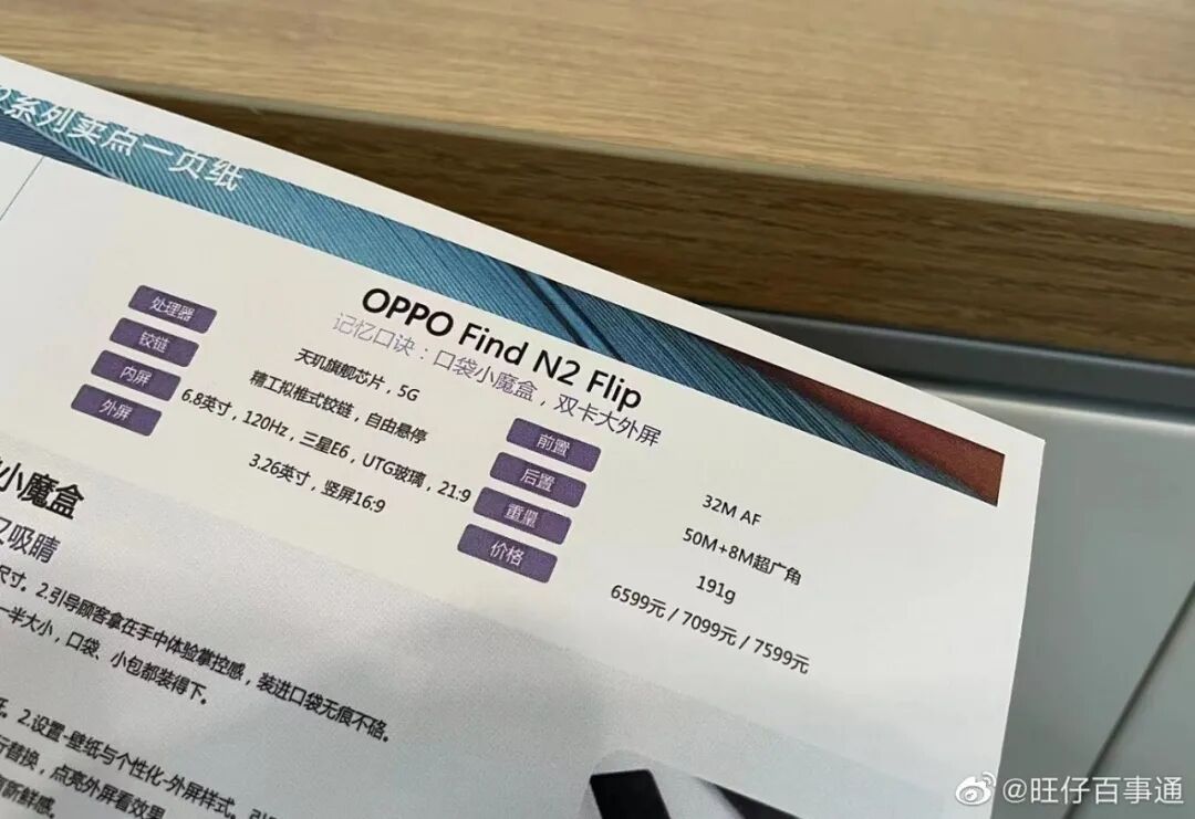 据曝光图显示,OPPO Find N2 Flip搭载天玑旗舰芯片,支持5G,内屏6.8英寸120Hz三星E6 UTG玻璃21:9屏幕,支持自由悬停,外屏3.26英寸16:9竖屏,前置32MP,后置50MP+8MP超广角,机身重约191g,售价或为6599元起。爆料真实性有待商榷,仅供大家参考。