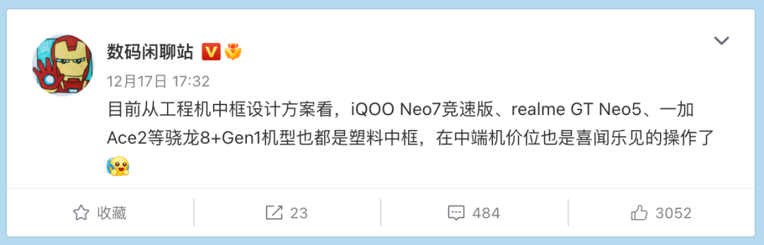 而机身细节上,iQOO Neo7竞速版、realme GT Neo5、一加Ace2等骁龙8+新机都是塑料中框,Redmi K60似乎也无缘金属中框。