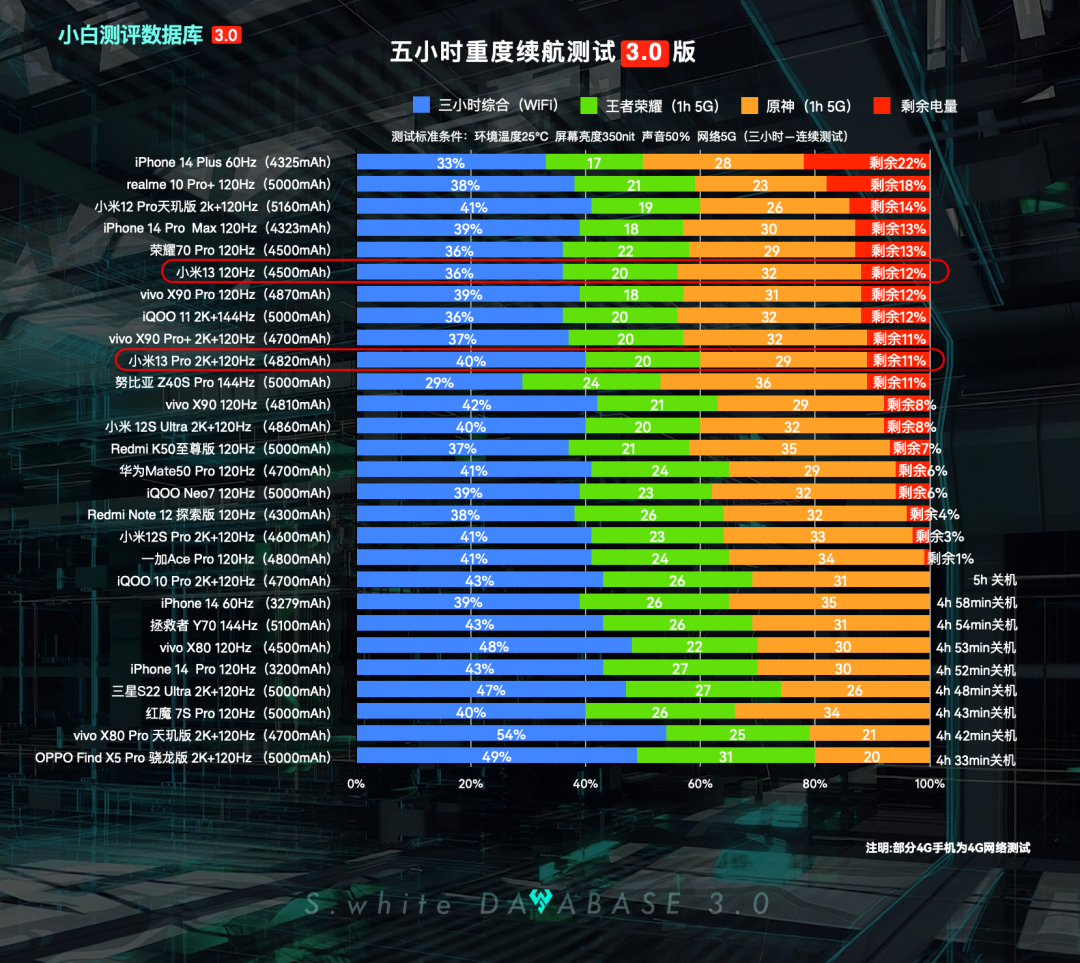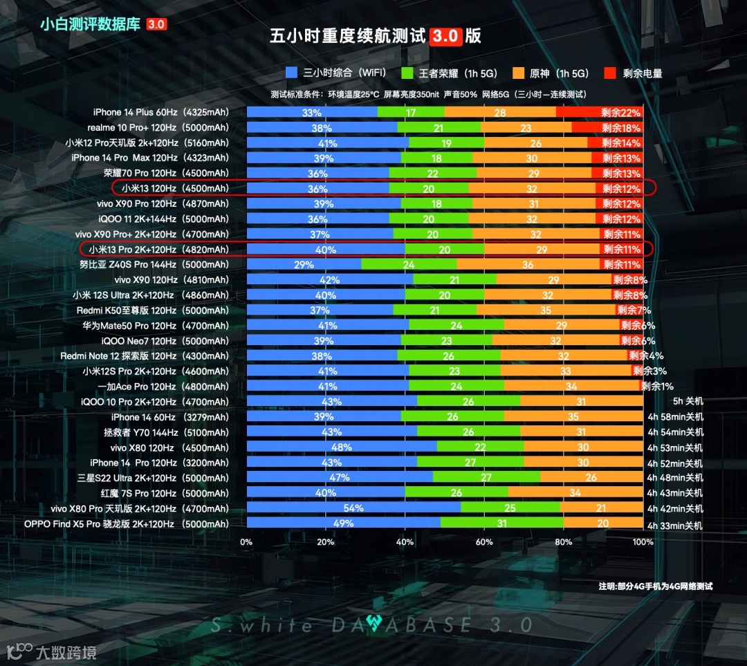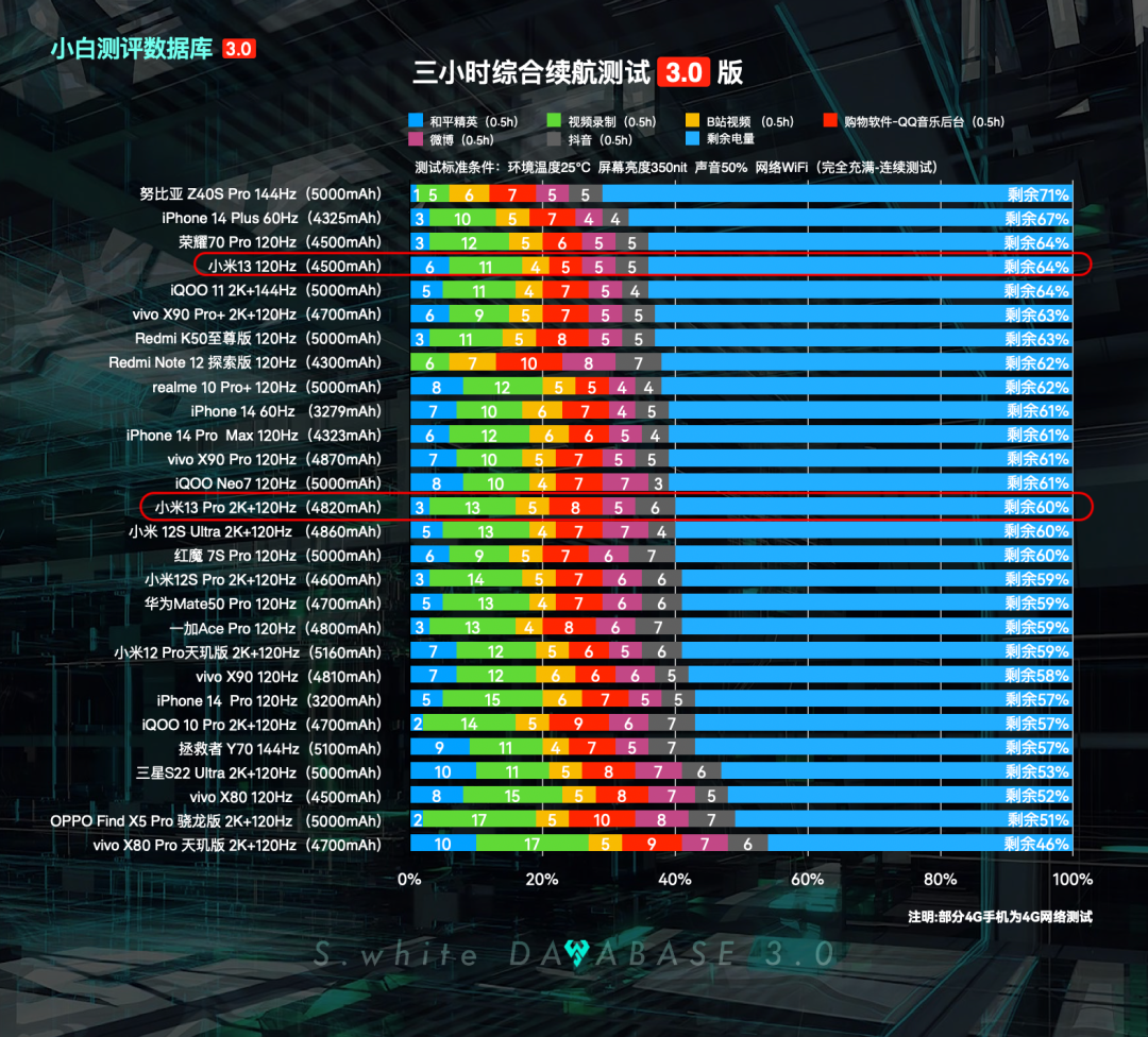 小米13 Pro续航:4820mAh,120Hz+2K,三小时综合续航模型电量剩余60%,五小时重度续航剩余11%,连续测试到关机,坚持了6小时2分钟;(*配图榜单仅代表目前小白测评数据库3.0模型下已测试机型的排行,不代表机圈所有手机排行)