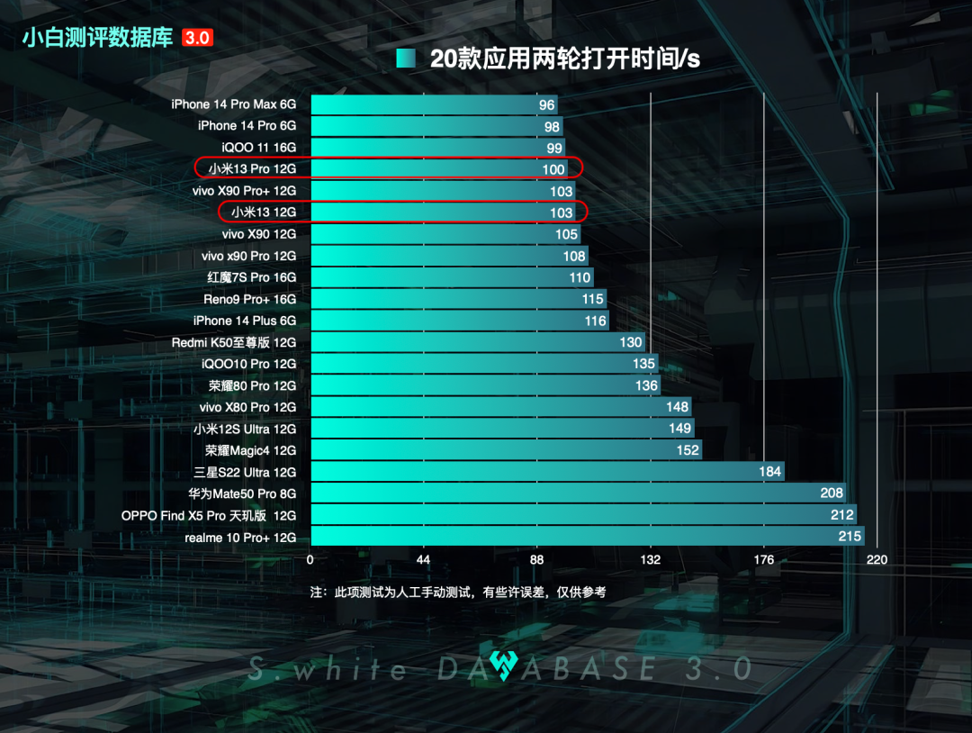 考验综合性能的 20款应用两轮打开 实测表现:小米13两轮打开总用时103秒;小米13 Pro两轮打开总用时100秒;(*配图榜单仅代表目前小白测评数据库3.0模型下已测试机型的排行,不代表机圈所有手机排行)