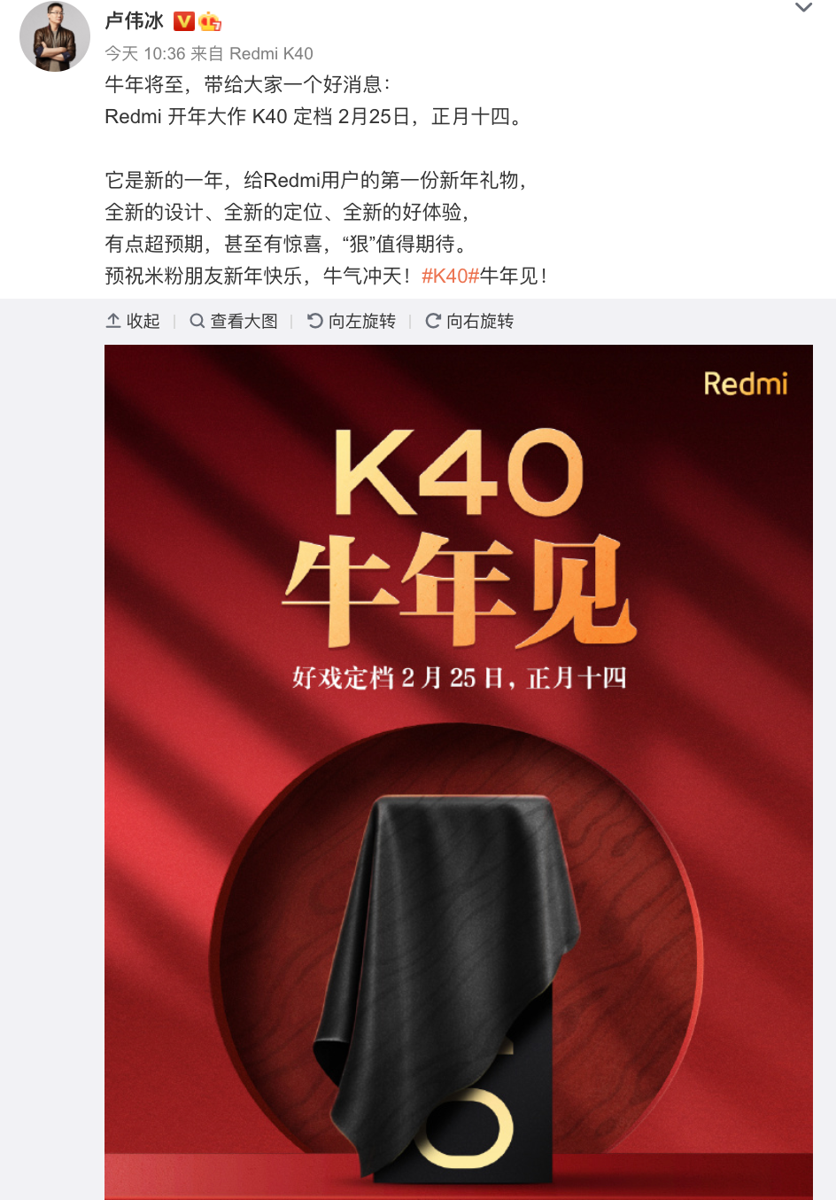 最近消息最多的莫过于Redmi K40系列,外观和主要配置估计就是那样,大家主要就等一个发布时间,今天上午卢伟冰正式官宣:Redmi K40系列发布会定档2月25日,也就是农历的正月十四。