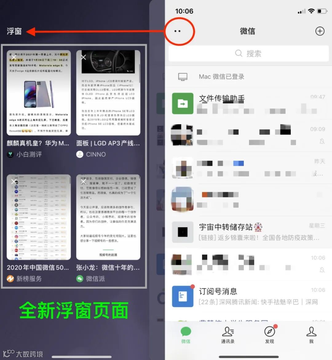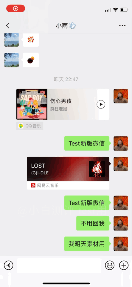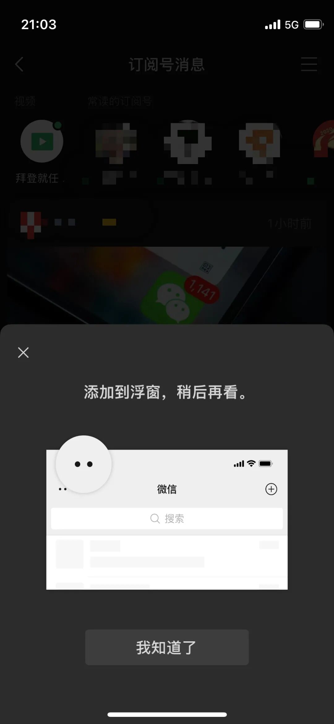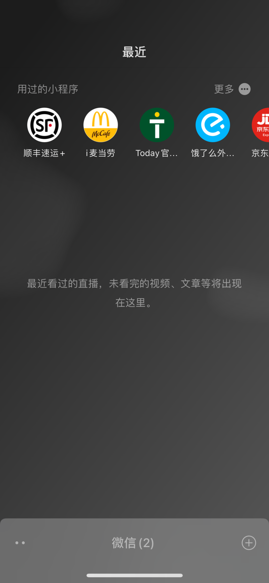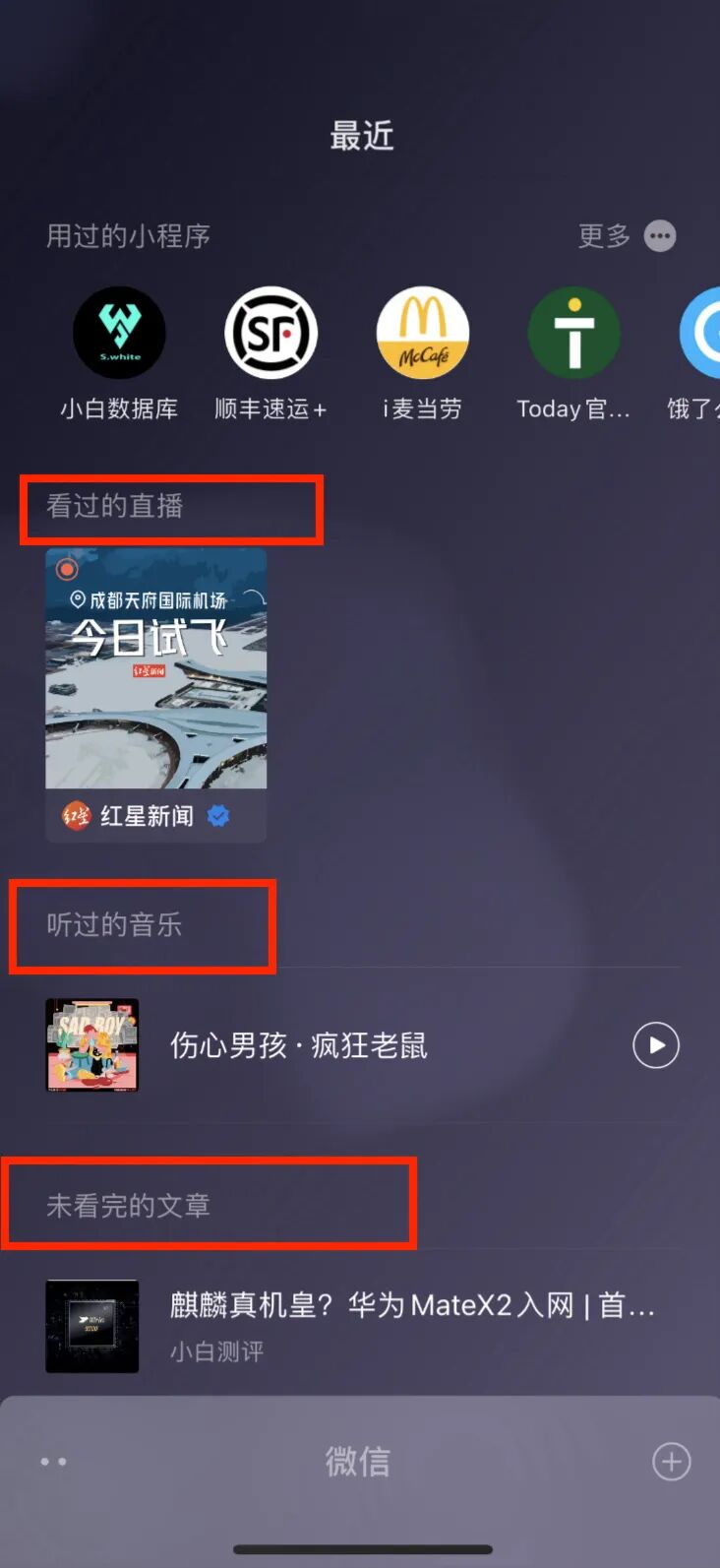 下拉聊天页面新增最近未看完的文章/音乐/视频等:包括用过的小程序,看过的直播、听过的音乐、未看完的文章等统一归纳于“最近”栏目。