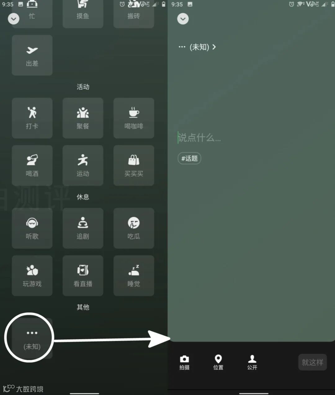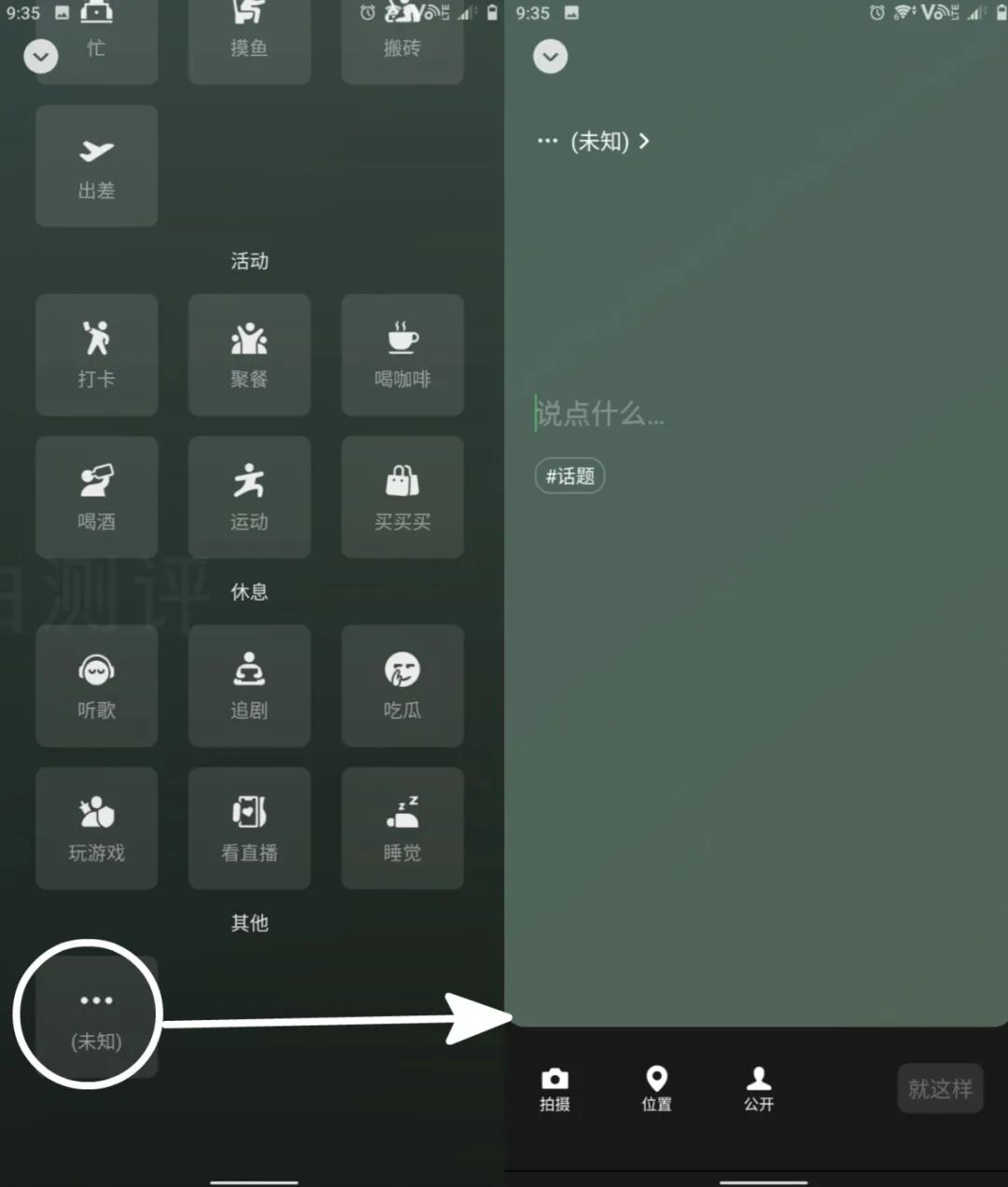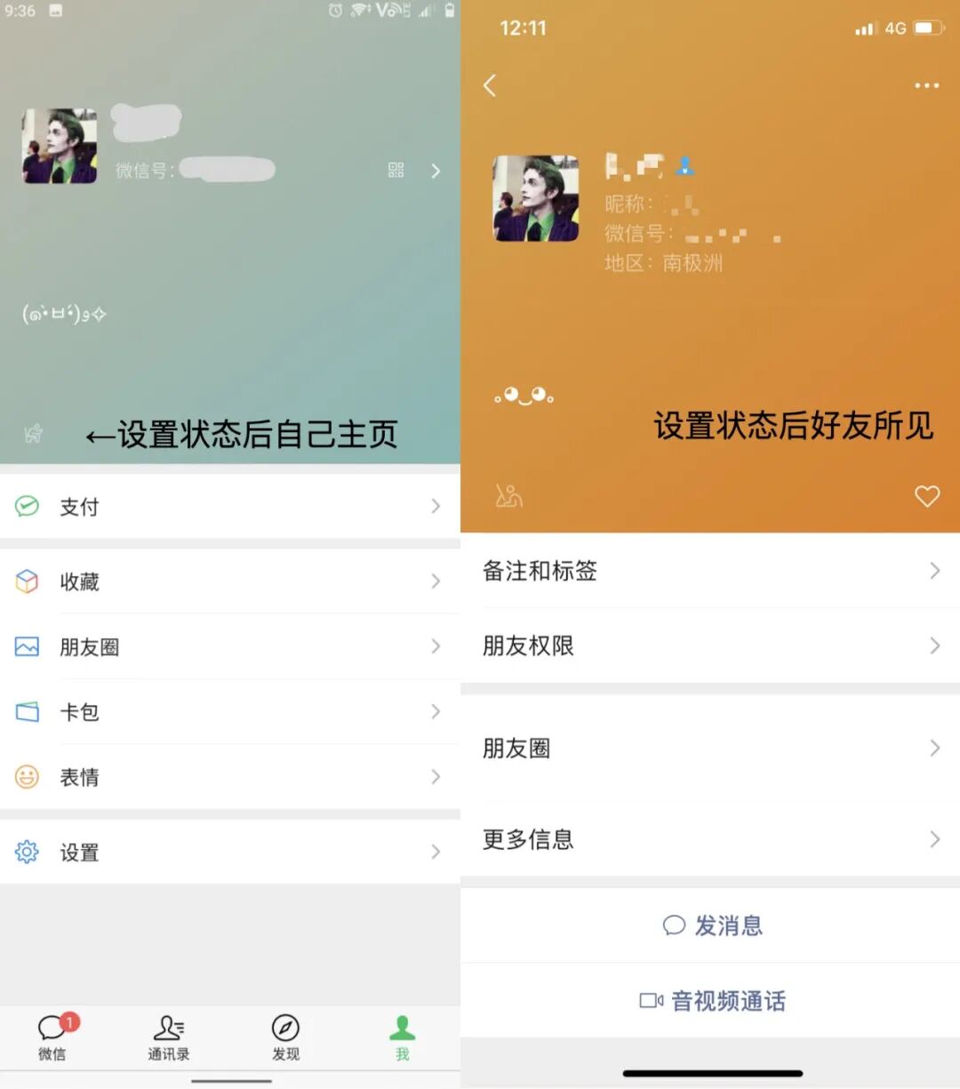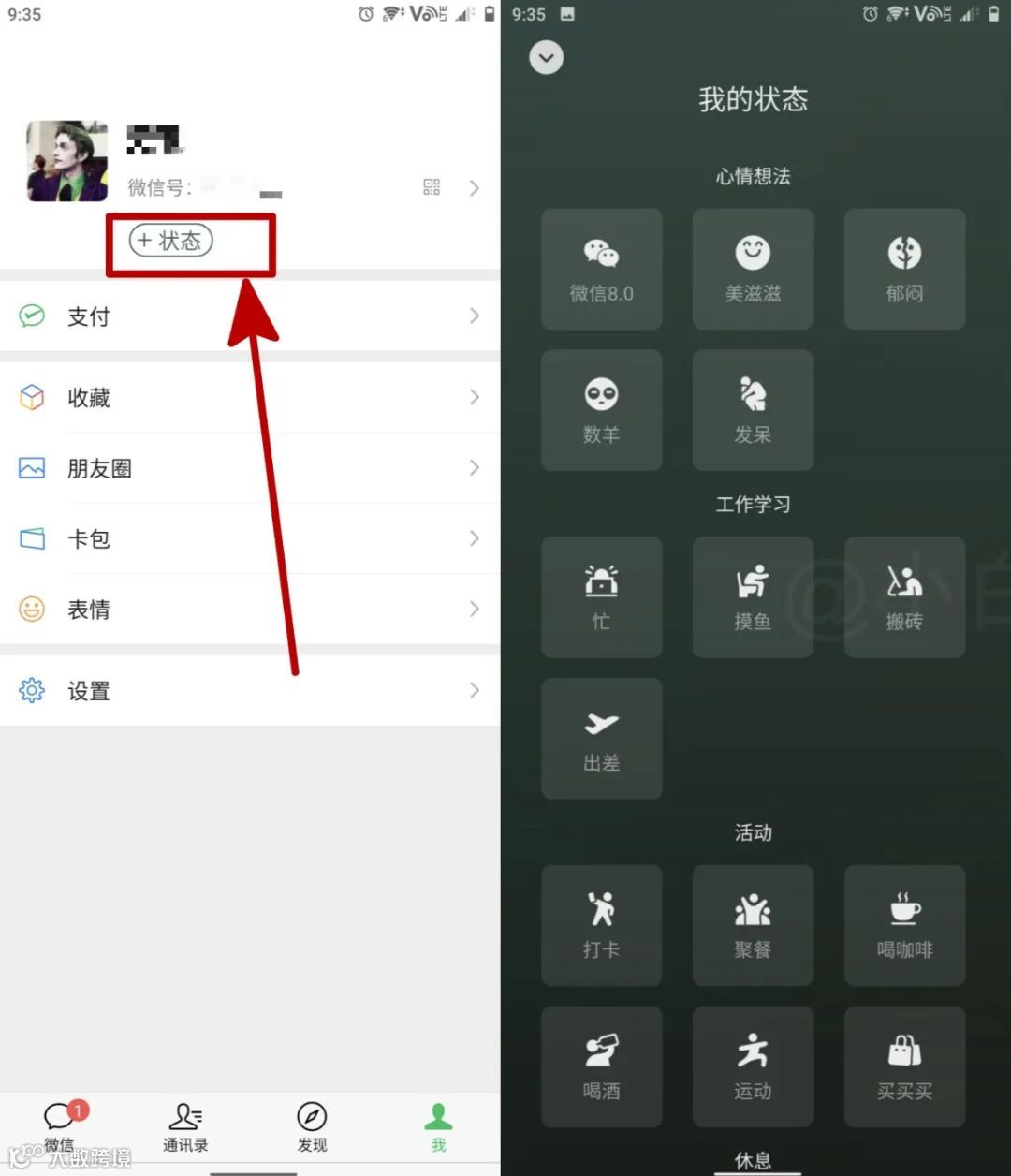 更新后在【我-微信号】下方可以看到新增「状态」,可选摸鱼、发呆、搬砖、出差等5个分类,细分21个常规状态以及1个自定义状态。