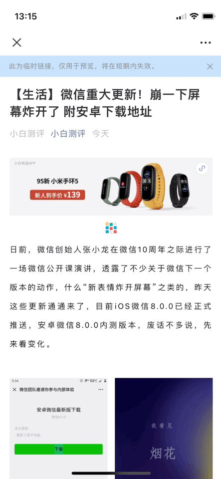 目前iOS端微信8.0.0已经正式推送,而安卓微信8.0.0是内测版本,但无论是iOS正式版还是安卓内测版,本质上都是8.0.0版,更新安装后一打开微信出现的就是上图右5个画面“我看见 笑脸、烟花、一首歌、你看见的、你”,也算概括了新版本的变化。