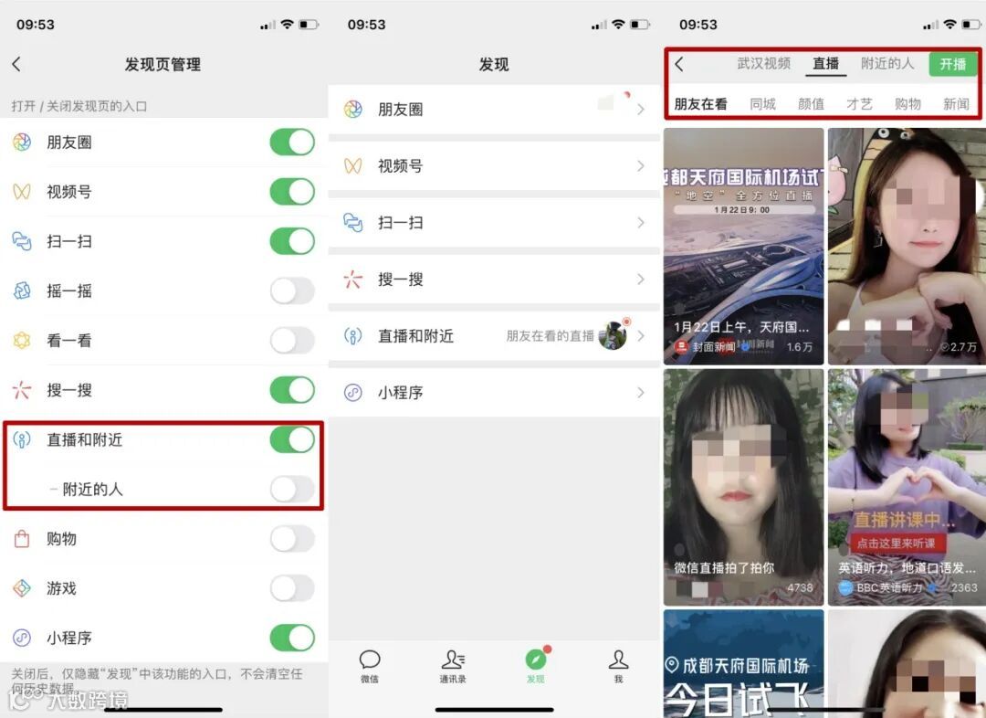 “附近的直播和人”更改为“直播和附近”,同城视频、直播、附近的人:直播栏目下细分朋友圈、同城、颜值、才艺、购物、新闻、教学、游戏、日常生活8个细分模块。