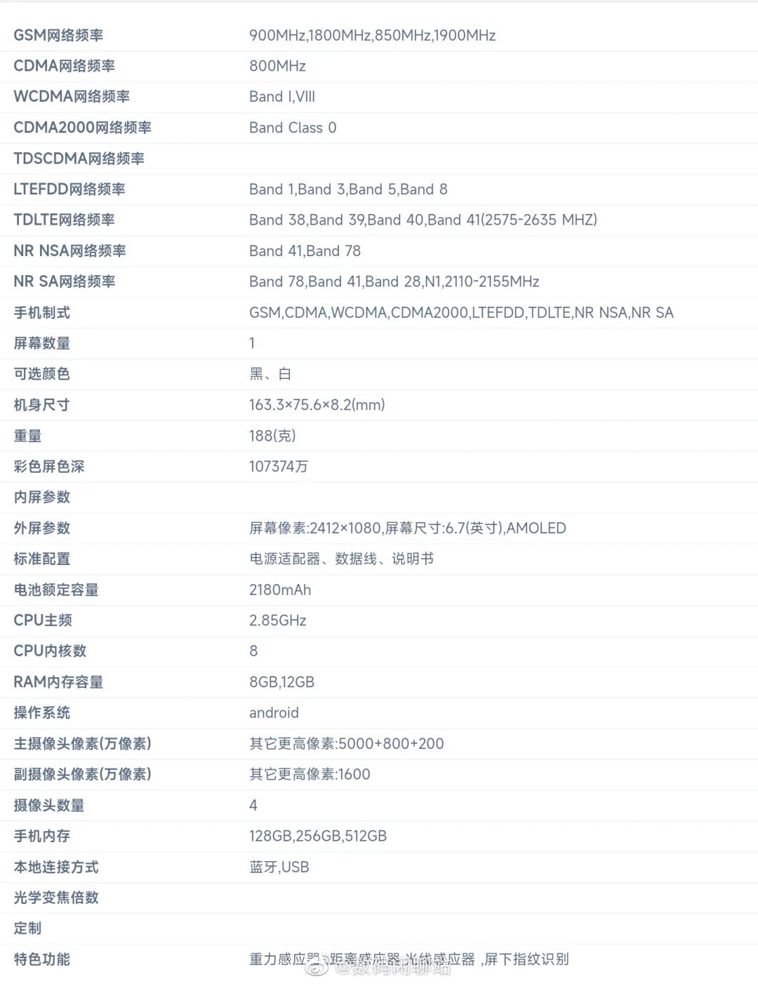 据爆料达人站哥表示,真我GT Neo3已经入网,主要参数有:6.7英寸FHD+分辨率的120Hz高刷 OLED居中单挖孔显示屏,10Bit色深,屏下指纹,天玑8100处理器,前置16MP,后置三摄50MP主摄索尼IMX766有ois➕8MP➕2MP,4500mAh/5000mAh双版本,机身厚约8.2mm/重约188g,保留3.5mm耳机孔。