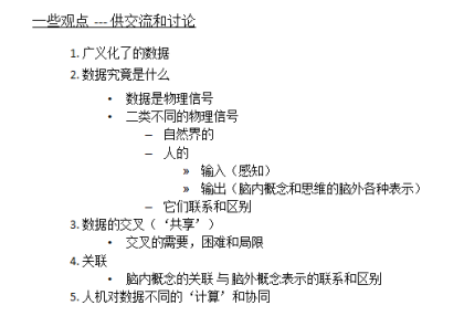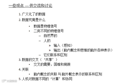 结合这次会议的主题,我想回归基础谈下我对现在我们几乎每天和到处在讲的‘数据’(包括大数据)究竟是什么的看法,它的产生(自然界的和人的),人对它的理解和使用,和它与人认知的关系,提出一些相关的观点,与大家交流讨论。