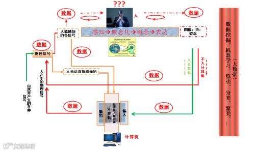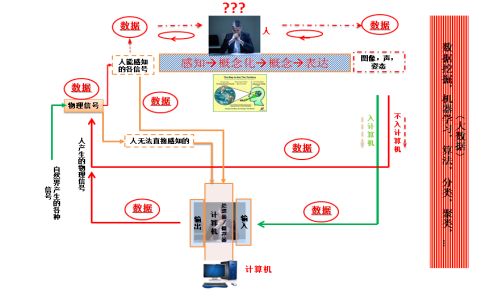 这图概括地描述了作为物理信号的数据在人-机间不断循环的过程,对人来讲数据就是生理上的刺激,然后经过感知、认知成为概念,产生思维,然后在需要表达时,通过手写,口说,姿态等形式或形态产生了新的物理信号,不断循环。可以说就是这人与数据循环互动的认知过程使我们不断认识和改变了我们的世界。
