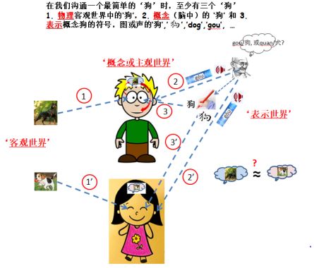 接下来请大家进一步思考上图中那男孩与女孩对狗的记忆,概念,经验,和以后对狗的表示和描述会是完全一样的吗?如不完全一样他们在什么情况下对狗的沟通不会有问题,什么时候会有困难?为什么。