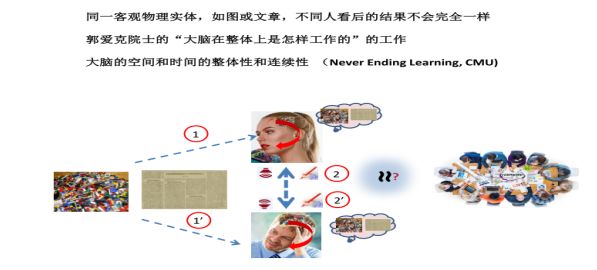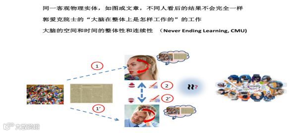 大脑对数据的记忆和处理在空间和时间上是整体的,连续的和可塑的。郭院士早些在他的主题演讲,“大脑在整体上是怎样工作的”,已从多方面给我们做了全面的介绍和解释。现在的概念,思考和表示与过去的经历、知识甚至意识有着复杂时空和整体上的联系和连续性。人对于概念的表示,如同一个词,不同人对它的理解不会完全一样,甚至会完全不同,就是这个原因。这是很困难的数据管理问题,机器不大可能来模拟和帮助解决。理论上讲如机器真能‘学习’和模拟好某个人的话,它得与这人自出身起就开始一起‘学习’同样的数据。卡內基梅隆大學计算机系有个人工智能项目称Never-Ending Learning。