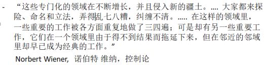 近年来越来越多的学科需要交叉发展的趋势明显,许多发明或创新也常发生在学科交叉的领域。控制论提出者维纳觉得“科学边界的交叉区域为合格的研究人员提供了最丰富的机会”,同时,他指出了交叉带来的问题和困难,如那些跨学科术语上的混乱,很像我们今天所面临的现状。这过程不大可能避免,只能通过稍有序些的沟通来发现区别和达成需要的新的共识。
