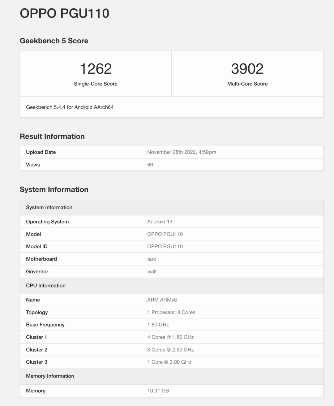 如上图所见,型号PGU110的新机或对应OPPO Find N2,12GB内存,Geekbench 5单核跑分1262,多核跑分3902,搭载的处理器主频频率为3.0Ghz,似乎是Reno9 Pro+同款骁龙8+低频版。