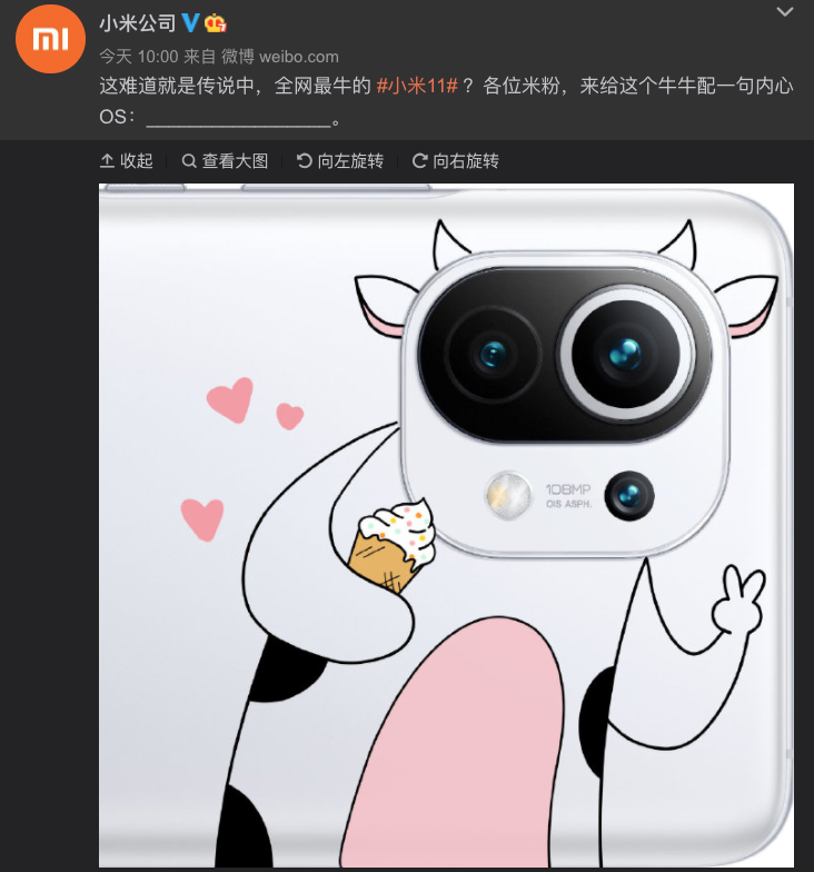 最后是一个特别有意思的图,早前民间曾根据小米11的后置相机模组制作了一组“牛啤”手机壳,没想到今天小米官方微博也晒了一张。