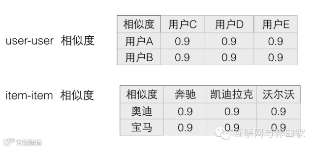 我一直在强调用户行为数据,目的就是为介绍协同过滤算法做铺垫。协同过滤,Collaborative Filtering,简称CF,广泛应用于如今的推荐系统中。通过协同过滤算法,可以算出两个相似度:user-user相似度矩阵; item-item相似度矩阵。