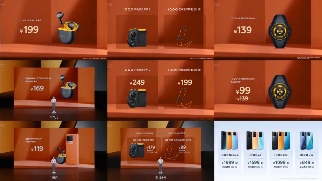 配件方面,iQOO TWS Air是199元(首发169元);iQOO闪电手柄2是249元(搭配购179);iQOO无线运动耳机活力版199元(搭配购99);iQOO极风散热背夹Neo是139元(首发99)。