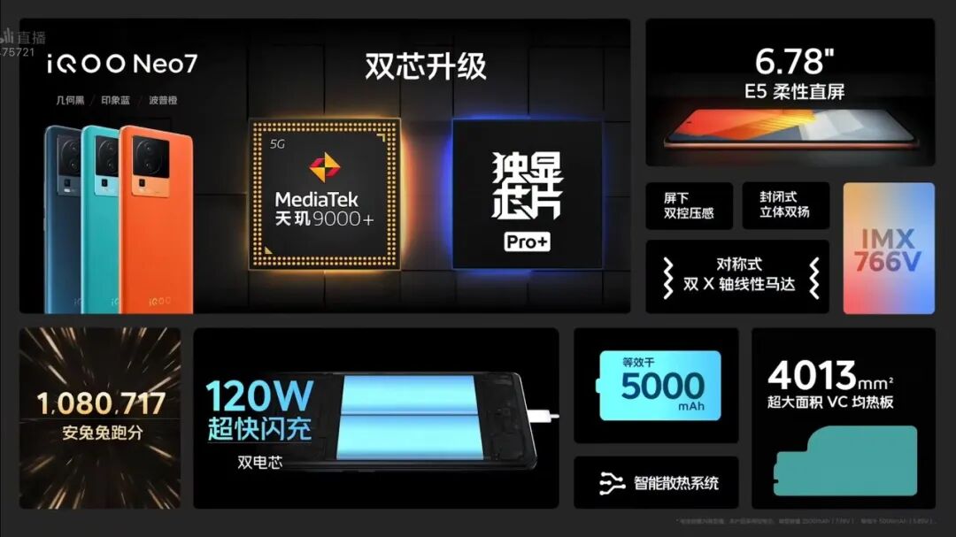 核心配置上,iQOO Neo 7搭载联发科天玑9000+处理器,LPDDR5+UFS 3.1,支持双模5G,5000mAh大电池+120W充电(9分钟充至50%),4013mm²大面积VC均热板,独立显示芯片Pro+,对称式双X轴线性马达,封闭式立体双扬声器,支持NFC、红外遥控等。