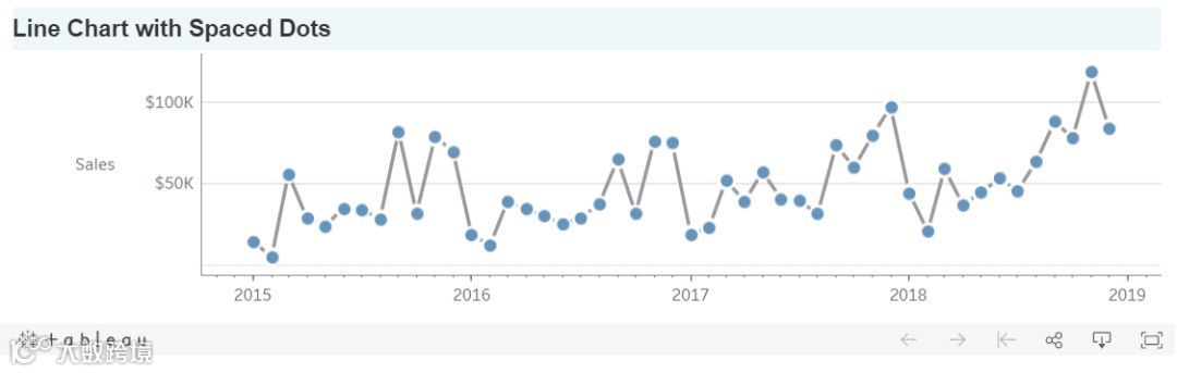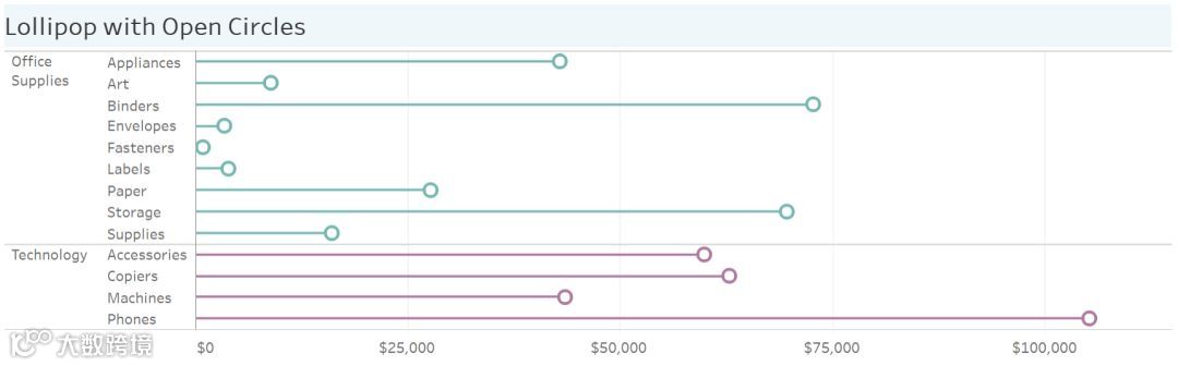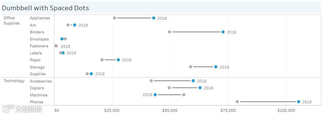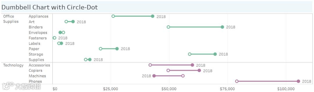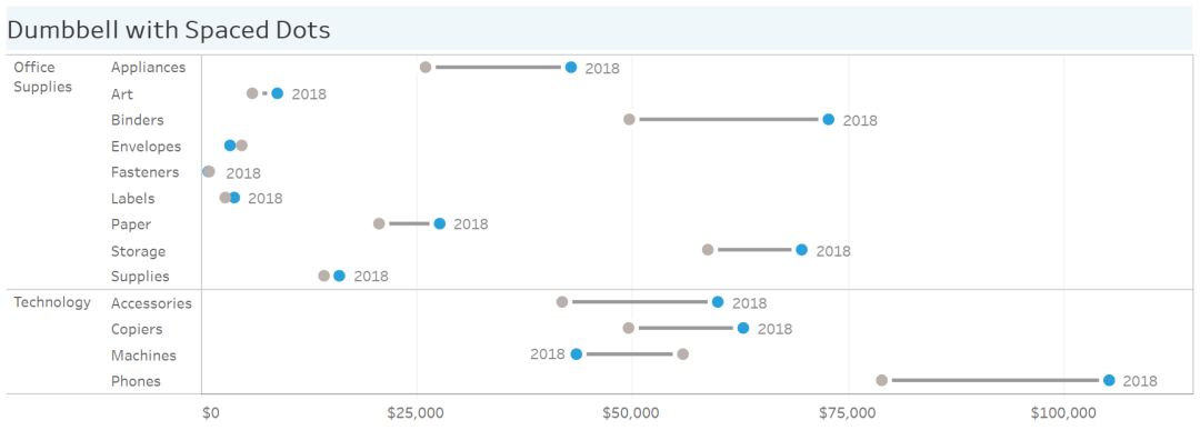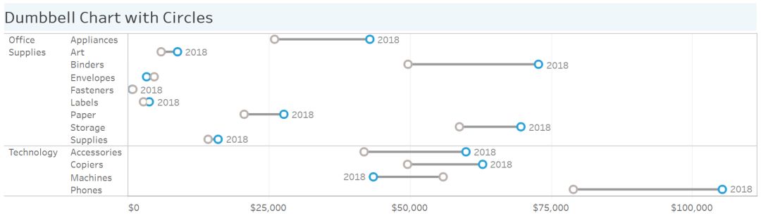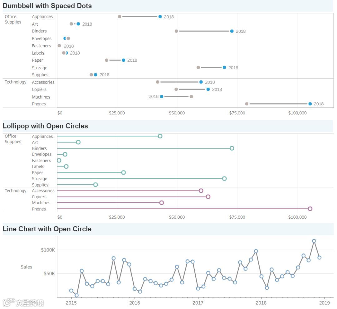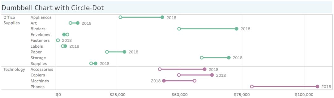 这些技巧可以用于创建棒棒糖图,哑铃图,或者任何包含了点与线组合的图表。此外,你还可以反转尺寸来将白色圆圈放在外部,以在点与点之间产生间隙。