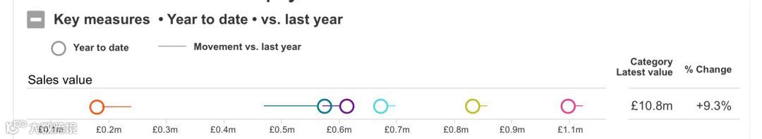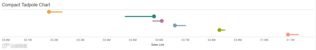 就个人而言,我喜欢Emma为这个由一条线和一个单点组成的图形提出的名称:蝌蚪图。建立一个蝌蚪图是简单直接的:它从哑铃图开始。但是一个单点只能显示当前时段而无法显示前一个时段的信息。在Tableau中,哑铃图很容易构建。它需要两个轴,一个轴作为点,另一个轴作为线来连接点。消除一个点是很简单的:用一个简单的计算来检查时间,如果时间等于当前的时间,则让其对应的值等于你的测量值,否则使对应值等于“NULL”。你可以在此处下载Mark的工作簿(https://public.tableau.com/views/TadpoleCharts/TadpoleCharts?:embed=y&:embed_code_version=3&:loadOrderID=0&:display_count=yes&publish=yes&:showVizHome=no )并按要求进行操作。
