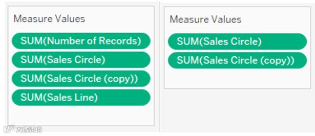 右键点击销售圈并选择“复制”,移动测量值到总和(销售圈)之上的列。这一操作会使测量值在列中替代总和(销售圈)。