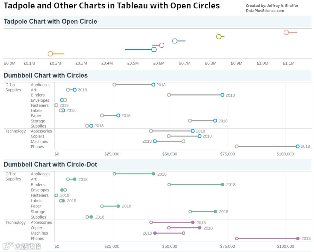 本文将通过分享多种方法,包括成功的与失败的尝试,来讲解如何在Tableau中创建蝌蚪图等带有空心圆的图表。