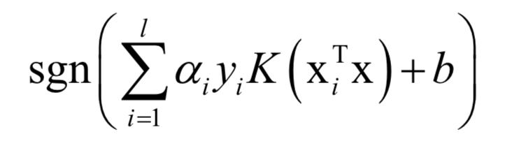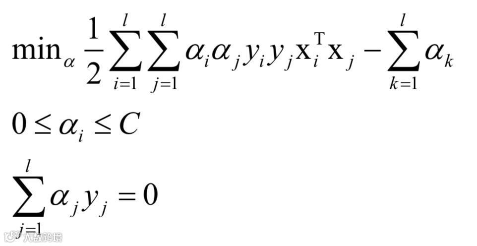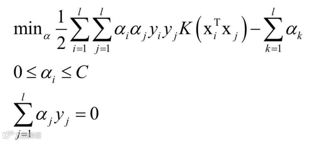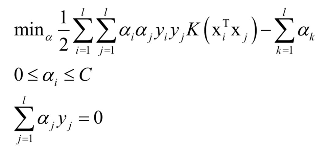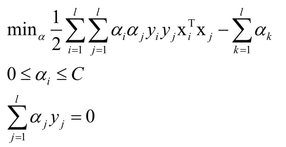如果不使用非线性核函数,SVM是一个线性模型。使用核函数之后,SVM训练时求解的对偶问题为: