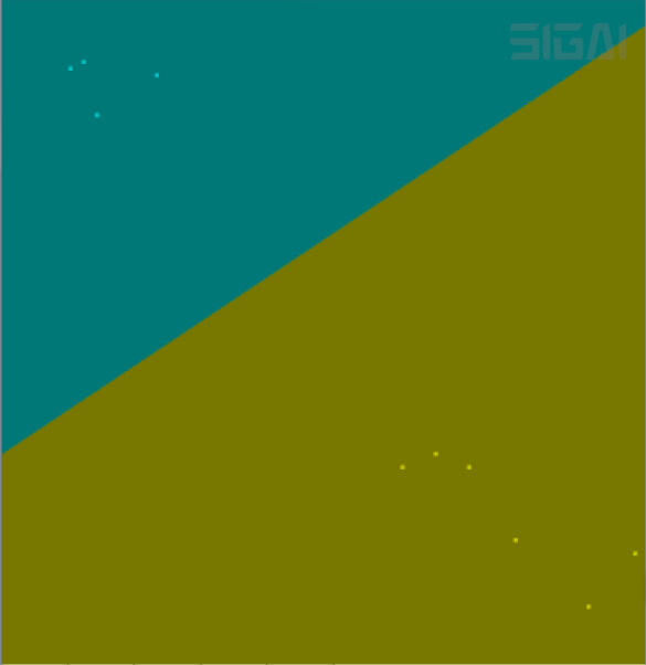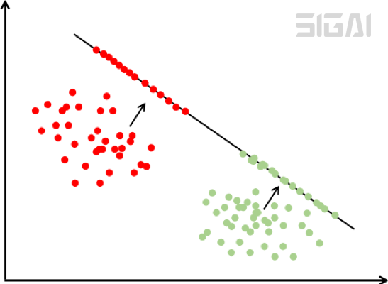 上图中特征向量是二维的,我们向一维空间即直线投影,投影后这些点位于直线上。在上面的图中有两类样本,通过向右上方的直线投影,两类样本被有效的分开了。绿色的样本投影之后位于直线的下半部分,红色的样本投影之后位于直线的上半部分。