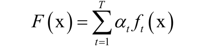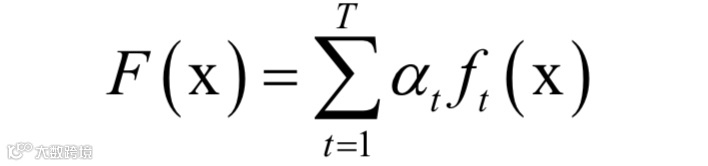 AdaBoost算法的全称是自适应boosting(Adaptive Boosting),是一种用于二分类问题的算法,它用弱分类器的线性组合来构造强分类器。弱分类器的性能不用太好,仅比随机猜测强,依靠它们可以构造出一个非常准确的强分类器。强分类器的计算公式为: