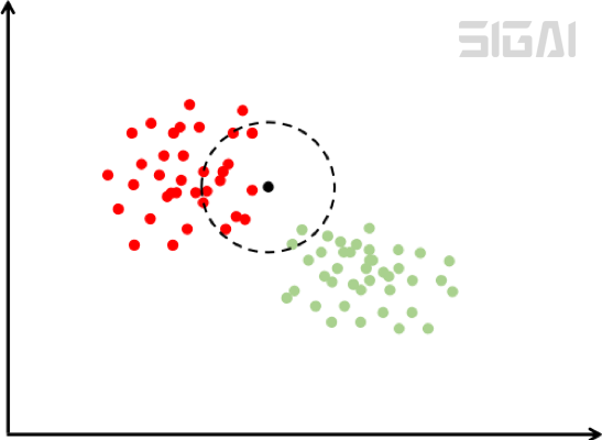 在上图中有红色和绿色两类样本。对于待分类样本即图中的黑色点,寻找离该样本最近的一部分训练样本,在图中是以这个矩形样本为圆心的某一圆范围内的所有样本。然后统计这些样本所属的类别,在这里红色点有12个,圆形有2个,因此把这个样本判定为红色这一类。