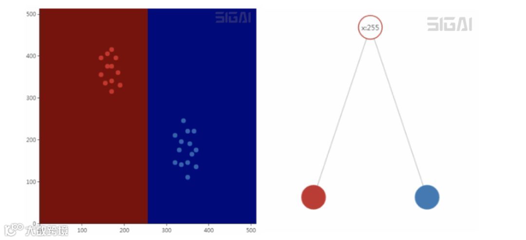 决策树在本质上是一组嵌套的if-else判定规则,从数学上看是分段常数函数,对应于用平行于坐标轴的平面对空间的划分。判定规则是人类处理很多问题时的常用方法,这些规则是我们通过经验总结出来的,而决策树的这些规则是通过训练样本自动学习得到的。下面是一棵简单的决策树以及它对空间的划分结果: