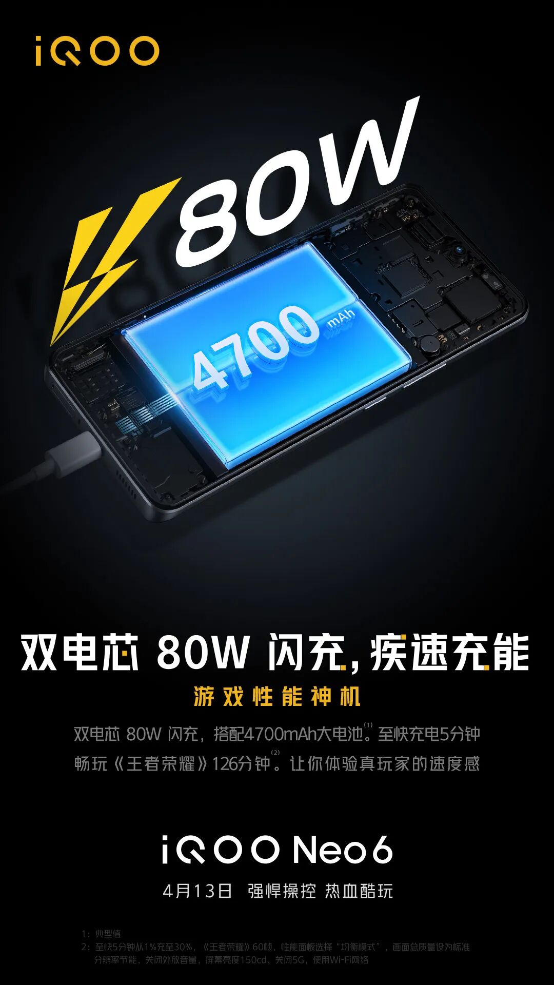 iQOO Neo 6预热将于4月13日即本周三晚上19:30发布,这些天官方预热了不少信息,今天官方公布了快充等信息。