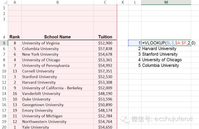 VLOOKUP是按列查找函数,最终返回该列所需查询列序所对应的值。此处我们可以看到一个数据表,第一列是法学院排名。我们可以用VLOOKUP来创建一个排名前五的学校的查询。