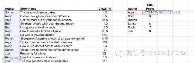Sumif函数的用法是根据指定条件对若干单元格、区域或引用求和。下面是我们在计算每一个作者的总体浏览数。范围上来说,作者名字的范围格式前后并不一致,但总数相同。B列对应相应作者的名字,E列则对应每个作者作品的浏览数。