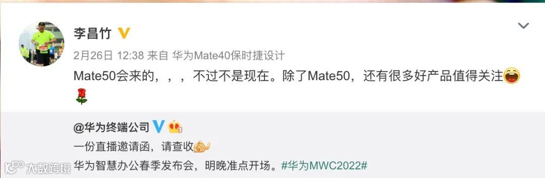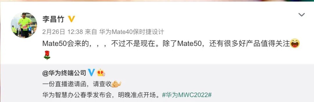 而华为Mate 50系列或搭载高通骁龙8 Gen1的4G版本,预计7月左右发布,届时应该也会首发出厂预装全新HarmonyOS 3.0。上图为华为消费者BG战略Marketing部副总裁在微博预热「Mate50会来的」的截图。不知道全新HarmonyOS 3.0会有哪些变化与升级~