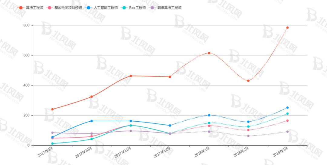 受招聘季影响,2017年人工智能职位量存在一定波动,但总体需求呈上升趋势,预计2018年将是人工智能的元年,人工智能人才需求可能成倍增长。