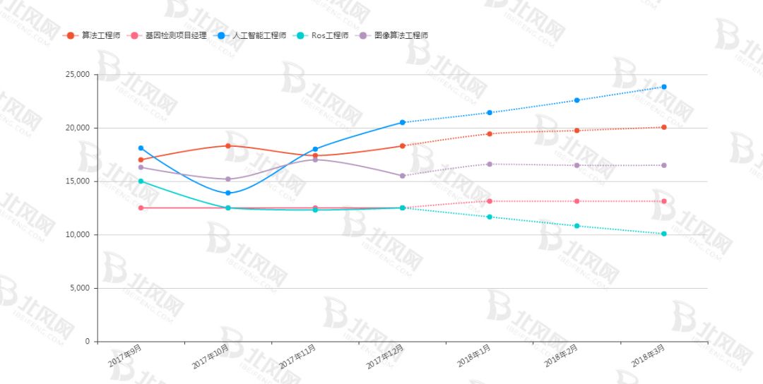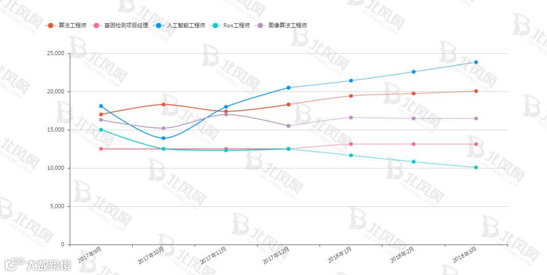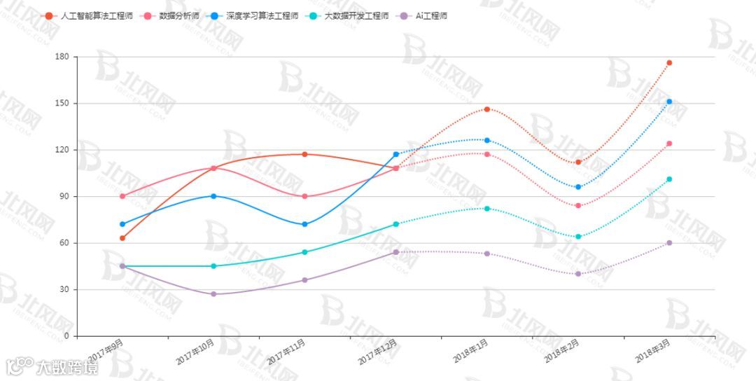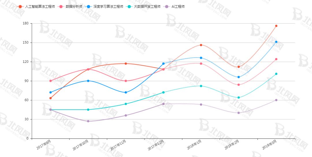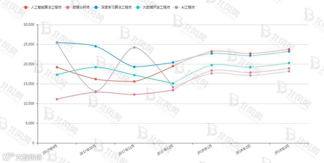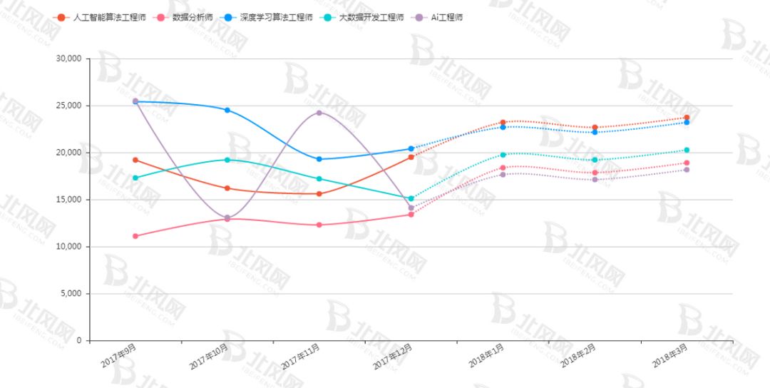 薪水总体呈上升趋势,特别是人工智能工程师职位上升明显。