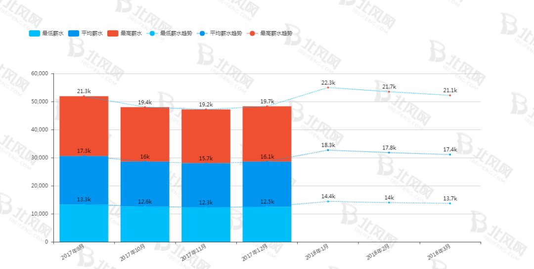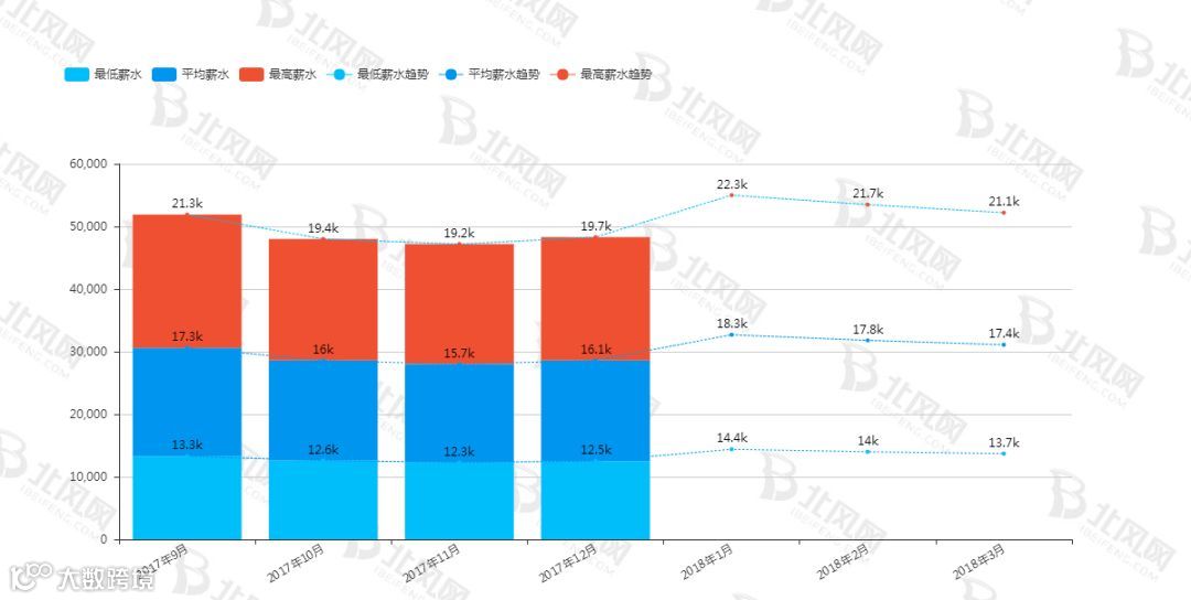 2017年人工智能行业职位薪水总体趋势波动不大,平均最低月薪基本在13k左右,平均最高月薪能达到21k+,预计2018年薪水将会有明显上升,发展“钱”途良好。