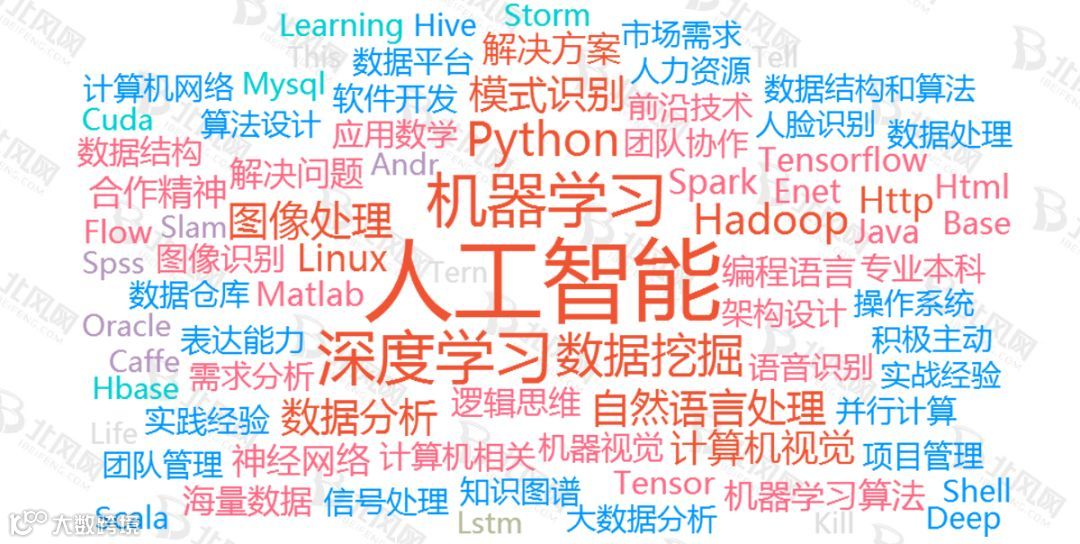 对招聘需求进行分词和词频统计,通过绘制词云图可以看出,深度学习、机器学习、Python、图像处理、自然语言处理、模式识别等是人工智能行业的主流技能