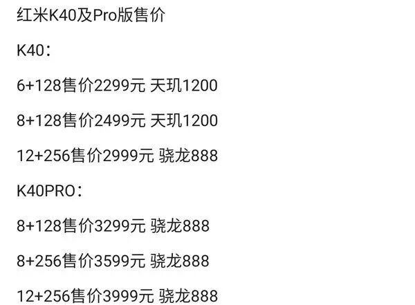 今天有网友带来了一份更详细的爆料,其称Redmi K40系列分为K40和K40 Pro,其中Redmi K40:6+128GB(天玑1200)售2299元,8+128GB(天玑1200)售2499元,12+256GB(骁龙888)售2999元;