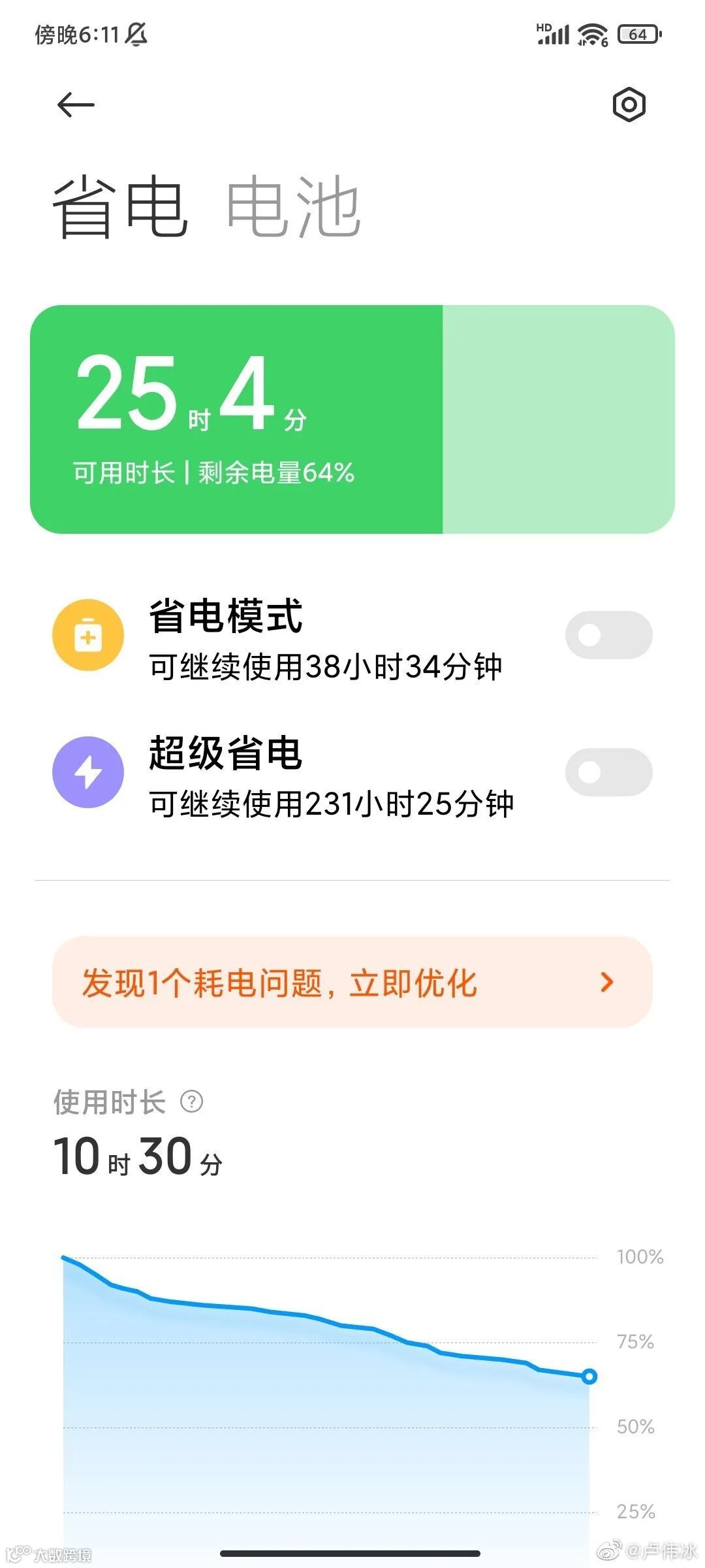 继晒出微博小尾巴、Redmi K40系列全系标配双扬声器后,今天卢伟冰晒出了一张K40的续航截图:使用10小时30分钟后,电量还有64%,可继续使用25时4分左右。同时通过对比状态栏图标,应该可以实锤是居中单挖孔屏?🤔