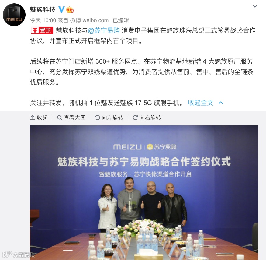 今天上午魅族官方宣布:魅族科技已与苏宁易购签署战略合作协议,后续将在苏宁门店新增 300+ 魅族服务网点、在苏宁物流基地新增 4 大魅族原厂服务中心。和苏宁铺设新的销售渠道也算是能拓宽一些销量和完善售后吧。