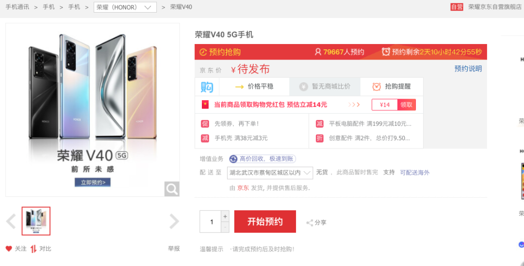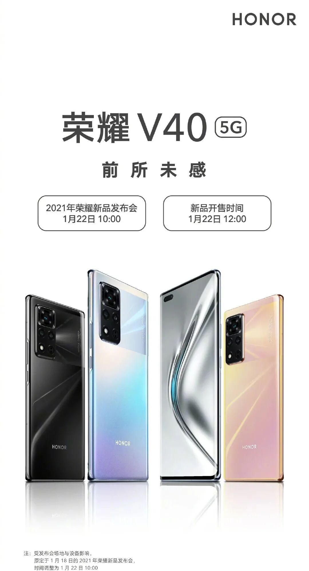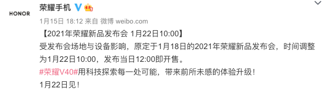 荣耀V40本来预热将于1月18日下周一正式发布,但昨天下午突然表示将延期举行发布会。