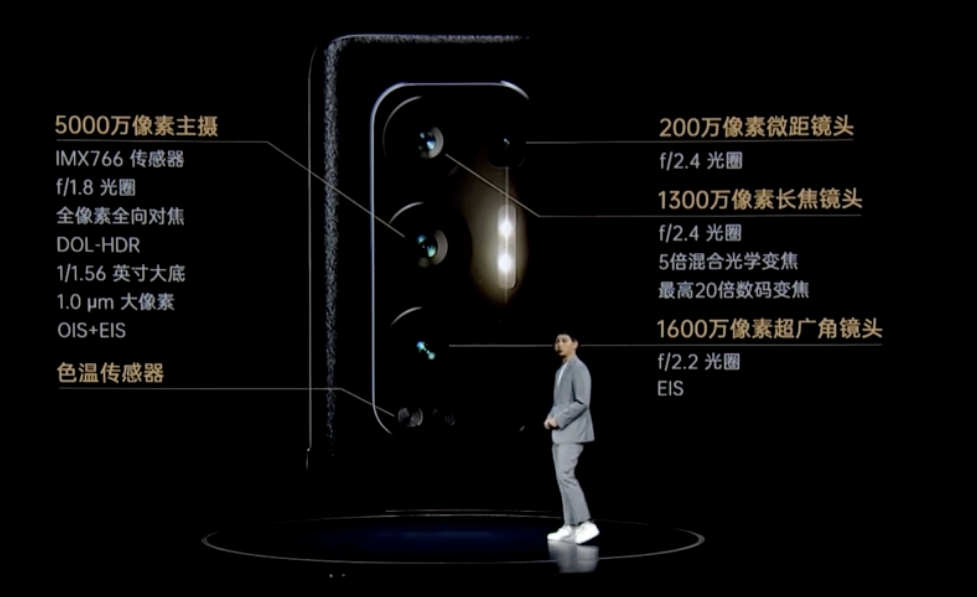 有ois)+②1600万像素超广角 F/2.2+③1300万像素长焦(F/2.4 5倍混合光变 20倍数码变焦)+④200万像素微距镜头。