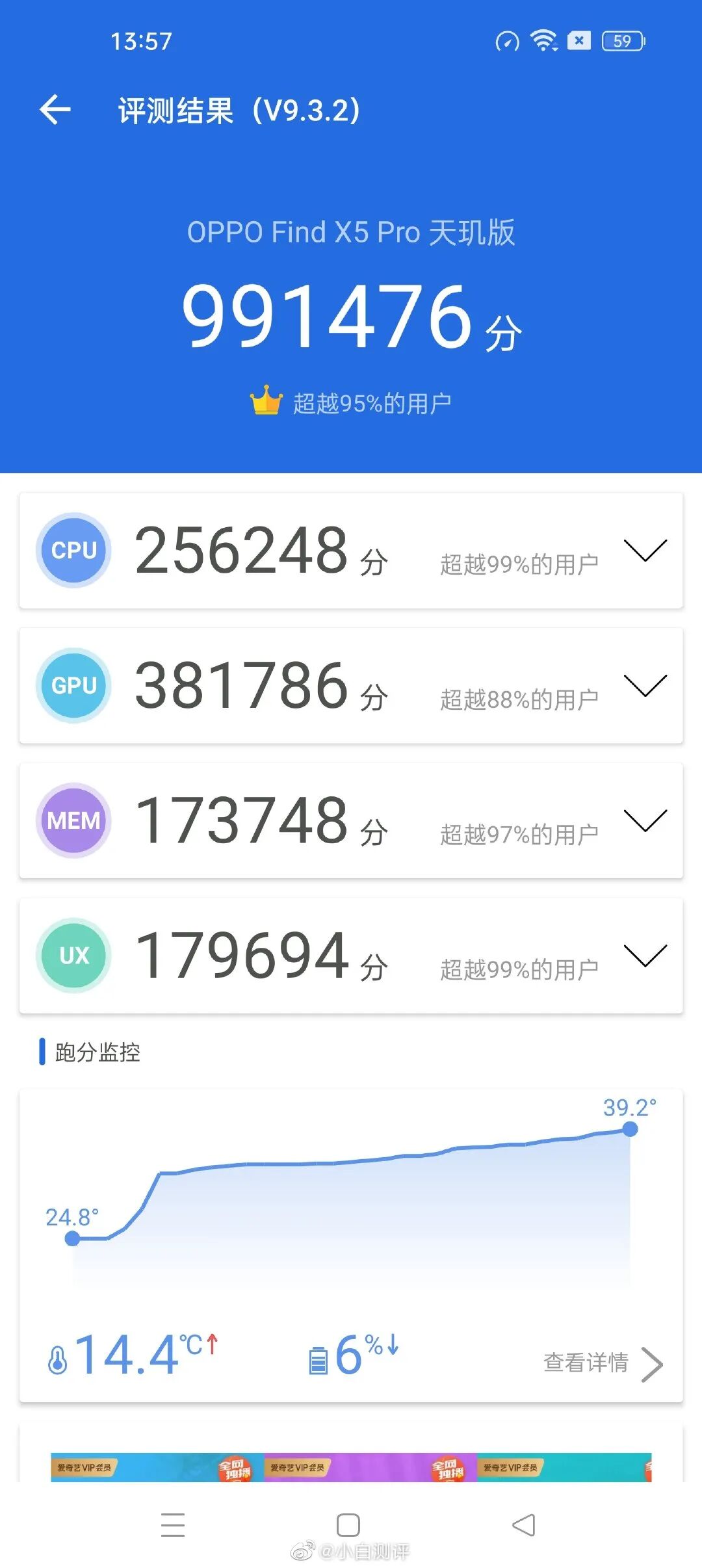 随手拿OPPO Find X5 Pro天玑版跑个安兔兔,室温下(室内温度25℃±1℃)综合跑分991476(基于最新版PFFM20_11_A.12系统测试)。