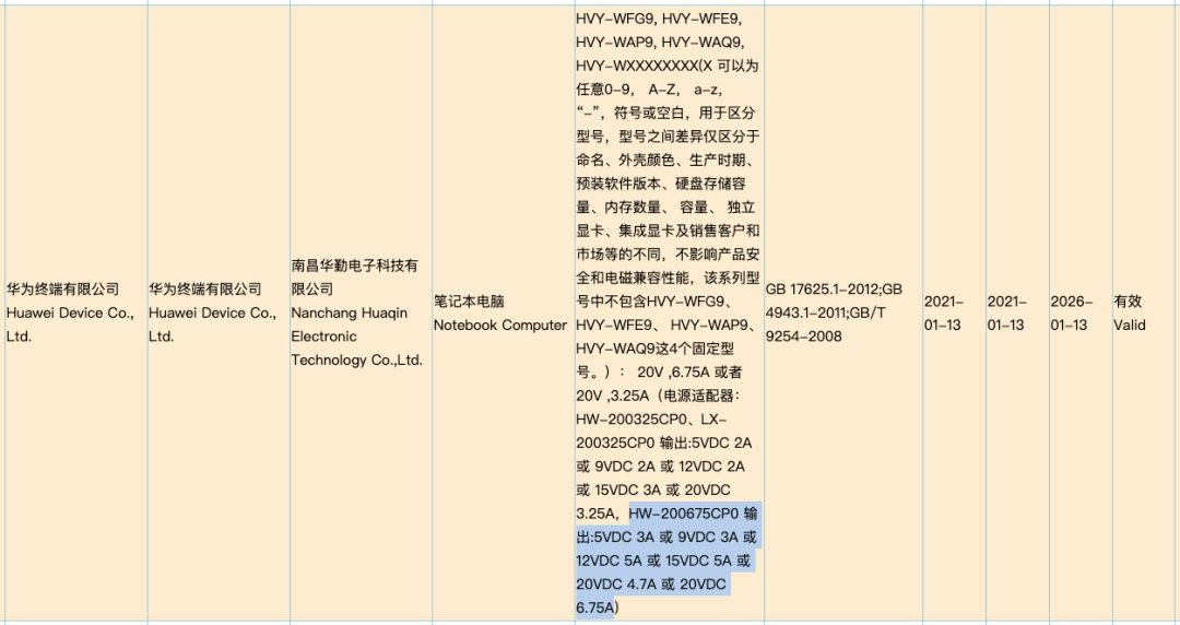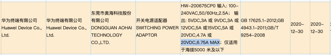 型号为HW-200675CP0,由东莞市奥海科技负责生产,支持15W、27W、60W、75W、94W、135W 六个功率档位。也因此有网友猜测是否华为P50系列或者未来新旗舰最高有望支持135W超级快充。