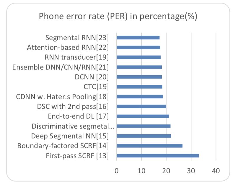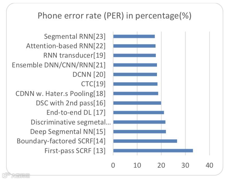 深度学习通过 TIMIT 数据集(通用数据集通常用于评估)完成的小规模识别任务是深度学习在语音识别领域的初次成功体现。TIMIT 连续声音 - 语音语料库包含 630 位来自美国的八种主要英语口音使用者,每位发言人读取 10 个句子。下图总结了包括早期结果在内的错误率,并以过去 20 年的电话错误率(PER)来衡量。条形图清楚地表明,与 TIMIT 数据集上以前的机器学习方法相比,最近开发的深度学习方法(图顶部)表现更好。