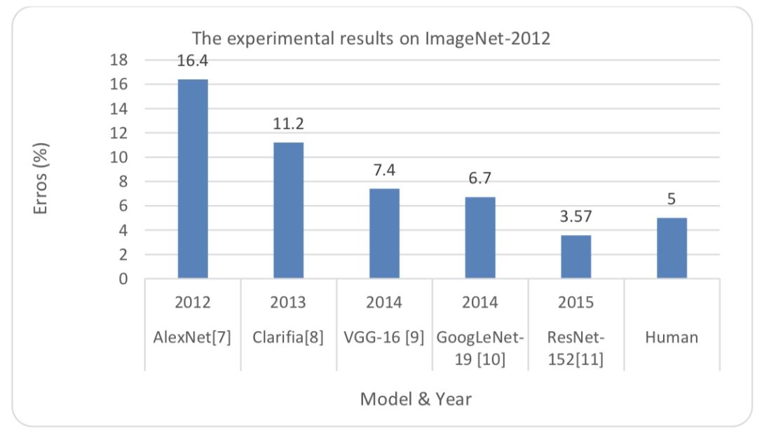 深度学习在图像分类领域的应用基准被称为大规模视觉识别挑战(LSVRC)。基于深度学习和卷积神经网络技术,深度学习在 ImageNet 测量精确度中有很好的表现 。近日,Russakovsky 等人发表了一篇关于 ImageNet 数据集的文章及近年来研究者们实现的最高精确度 。下图显示了 2012 年深度学习技术的发展历程。时至今日,我们开发的方法在 ResNet-152 上只有 3.57%的误差,低于人类约 5% 的误差。