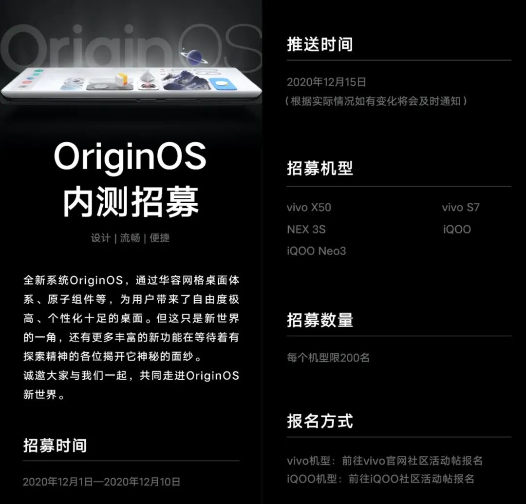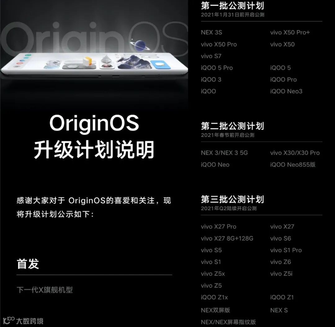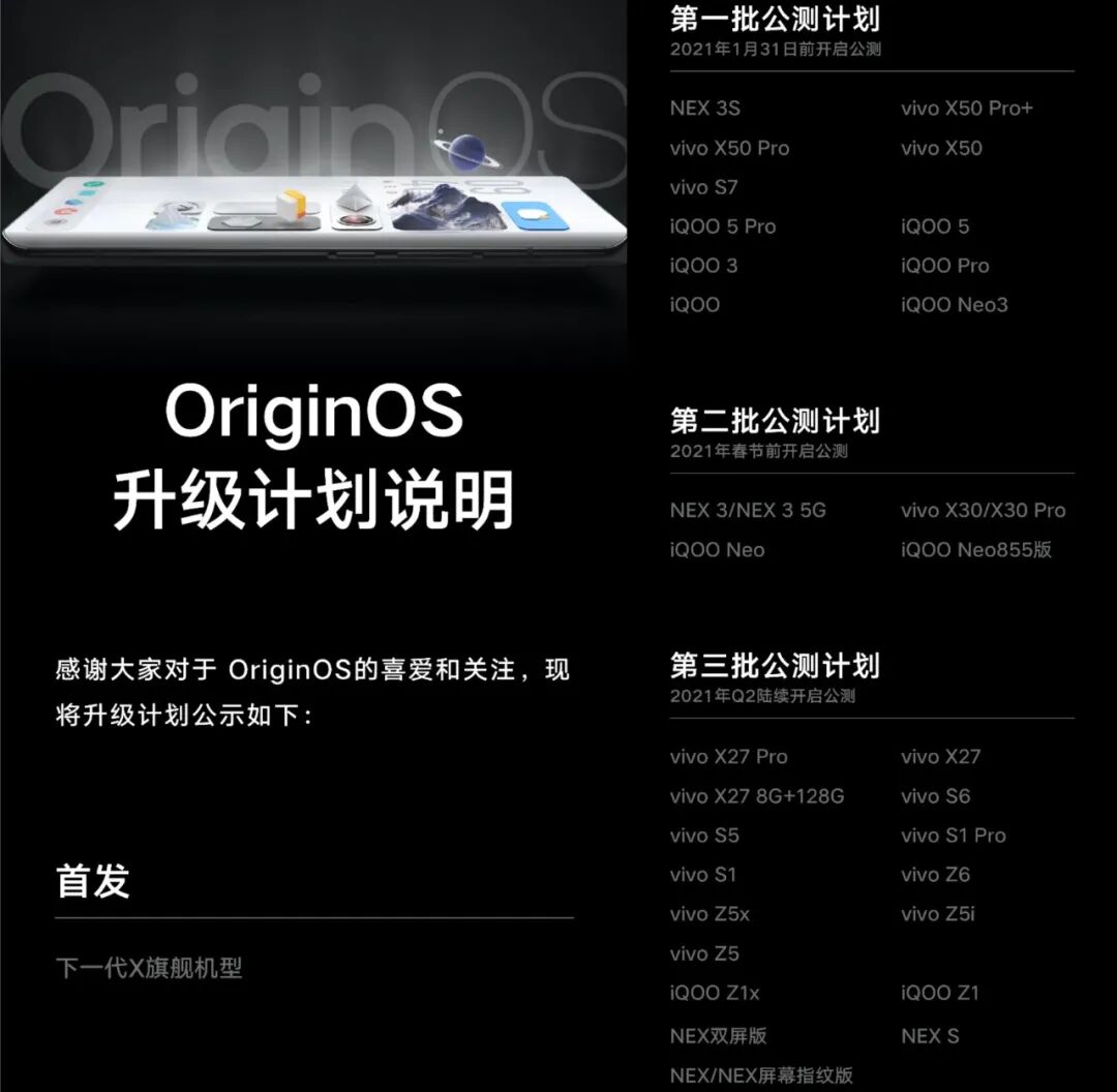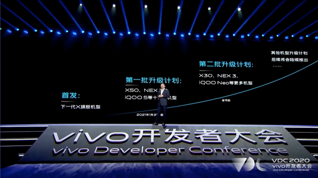 在11月18日的发布会上,官方预告老机型升级计划:①第一批2021年1月31日之前公测:vivo X50/Pro/Pro+、vivo NEX3S、vivo S7、iQOO 5/Pro、iQOO、iQOO Pro、iQOO 3、iQOO Neo3共11款;